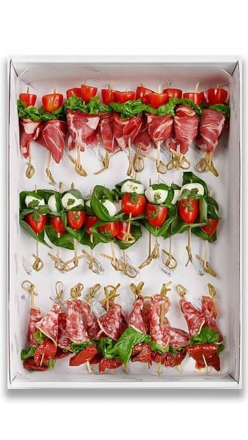 Presentación: Bandeja elegante con pinchos dispuestos en tres filas. Cada tipo claramente diferenciado para que tus invitados elijan su preferido.